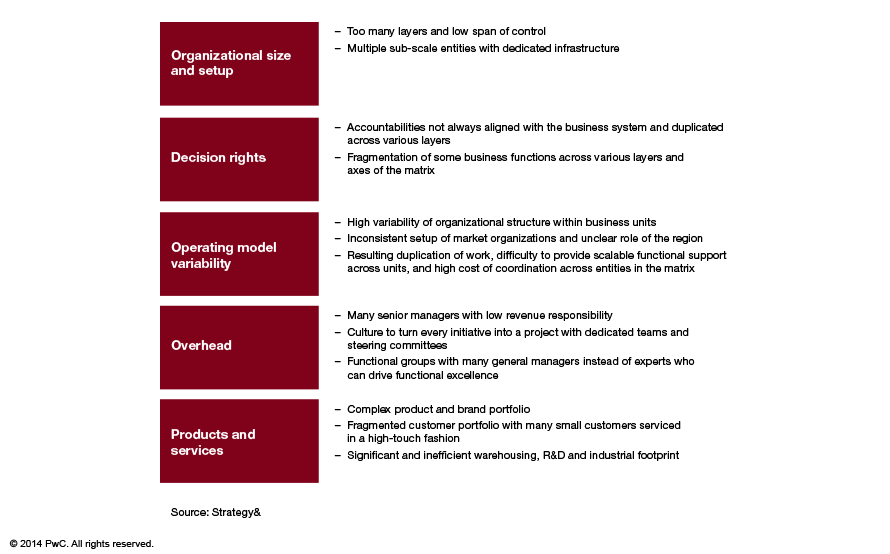 Our client, a multibillion-dollar consumer goods company active across several business areas (“businesses”) and a large number of geographies (“markets”), was facing a difficult business situation: It had been experiencing limited revenue growth, declining market shares, and increasing margin pressure. The leadership team, in analyzing the situation, had identified several underlying causes: slow decision making due to organizational complexity and massive overhead, limited success in its innovation efforts, lack of speed to market, and the inability to connect with end customers.
